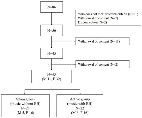 From April 2017 to January 2018, 86 subjects with insomnia, aged 20 to 59 years, were recruited from the community. All the subjects had an insomnia severity index of less than 15 and only mild symptoms of insomnia that did not interfere with daily life. Twenty-one subjects who met the International Classification of Sleep Disorders—Third Edition (ICSD-3) criteria [25] for insomnia disorder, had a BDI of 20 or more or had regularly taken related drugs within the past year were excluded from this study. We further excluded seven people who withdrew their consent and two people who could not be reached. Eleven subjects additionally withdrew their consent. To exclude subjects with sleep apnea, 45 subjects underwent polysomnography. Two of them withdrew their consent. Thus, a total of 43 subjects participated in this study (Figure 1). This study was approved by the institutional review board of Seoul National University Bundang Hospital (B-1702/381-002). The baseline demographic and clinical characteristics of the participants and their outcome measures for the two weeks of this study have previously been published [26].