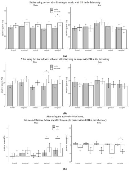 Comparison of the relative power between the baseline state and the state after stimulation for each brain region. (A) Before using device, after listening to music with BB in the laboratory. (B) After using the sham device at home, after listening to music with BB in the laboratory. (C) After using the active device at home, the mean difference before and after listening to music without BB in the laboratory. Vertical bars represent standard deviation; BB, binaural beat; *, Bonferroni corrected p-value < 0.05; †, p-value < 0.05.