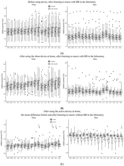 Comparison of the relative power between the baseline state and the state after stimulation for each electrode. (A) Before using device, after listening to music with BB in the laboratory. (B) After using the sham device at home, after listening to music with BB in the laboratory. (C) After using the active device at home, the mean difference before and after listening to music without BB in the laboratory. BB, binaural beat; *, Bonferroni corrected p-value < 0.05; †, p-value < 0.05.