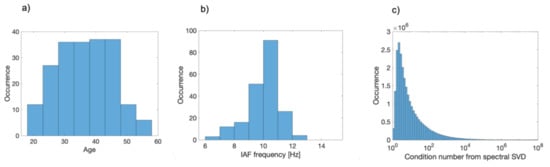 (a) Distribution of sample age. (b) Distribution of detected IAF on the whole sample. (c) Distribution of all condition numbers from SVD, aiming to define optimal dipole direction for spectral data.