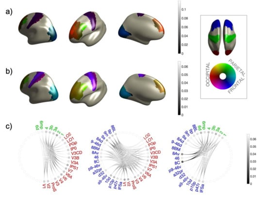 - Glasser, M.F.; Coalson, T.S.; Robinson, E.C.; Hacker, C.D.; Harwell, J.; Yacoub, E.; Ugurbil, K.; Andersson, J.; Beckmann, C.F.; Jenkinson, M.; et al. A multi-modal parcellation of human cerebral cortex. Nature 2016, 536, 171–178. [Google Scholar] [CrossRef] [PubMed]