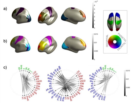 As regards the occipito–frontal connections, the highest WPPC connectivity and degree values has been found from frontal area 9a to the occipital sector, being and . The corresponding values for WPLI are and while, in this case, areas 9m and 9p have also been found among the most connected to the occipital sector ( and ; and ). This pattern is confirmed also by inspecting the connecto-grams in Figure 2c for WPPC and Figure 3c for WPLI, where, in the latter case, connectivity from frontal areas to occipital is more evident than in the WPPC case. As we pointed out before, we interpret this as a byproduct of the different sensitivity of WPPC and WPLI to coherent signals whose phase delay is more towards or .