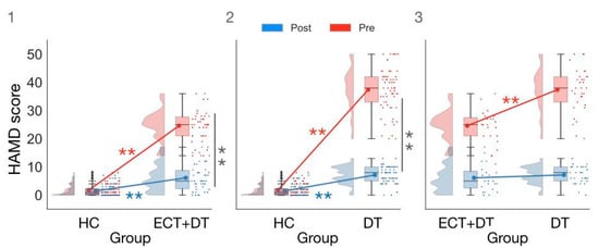 - Nuninga, J.O.; Claessens, T.F.; Somers, M.; Mandl, R.; Nieuwdorp, W.; Boks, M.P.; Bakker, S.; Begemann, M.J.; Heringa, S.; Sommer, I.E. Immediate and long-term effects of bilateral electroconvulsive therapy on cognitive functioning in patients with a depressive disorder. J. Affect. Disord. 2018, 238, 659–665. [Google Scholar] [CrossRef] [PubMed]