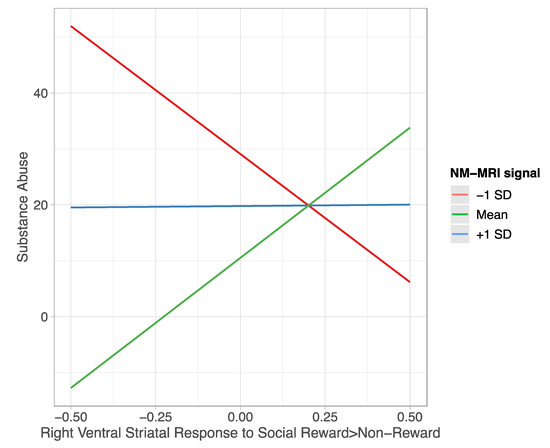 3.3.2. Moderating Effect of NM-MRI Signal on the Relation between Ventral Striatal Function during Reward Processing and Substance Abuse