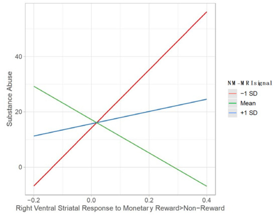 Depiction of moderating effect of NM-MRI signal on the relation between right ventral striatal response to monetary reward (vs. non-reward) and substance abuse. SD = standard deviation.