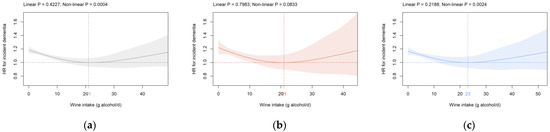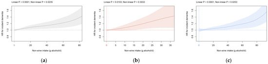 Association of non-wine intake (g alcohol/d) with dementia risk in the primary cohort in (a) all participants, (b) females, and (c) males. Data are adjusted and presented as indicated in Figure 1.