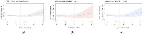 Association of coffee intake (cups/d) with dementia risk in the primary cohort in (a) all participants, (b) females, and (c) males. Data are adjusted and presented as indicated in Figure 1.