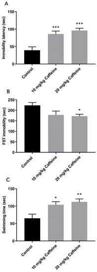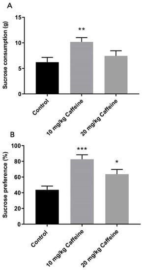 Sucrose consumption in the 10 mg/kg caffeine treatment group was significantly higher compared to the control group (p = 0.01) (Figure 2A). Caffeine treatment groups had a higher sucrose preference (%) compared to the control group (10 mg/kg vs. control p < 0.001; 20 mg/kg vs. control p < 0.05) (Figure 2B).
