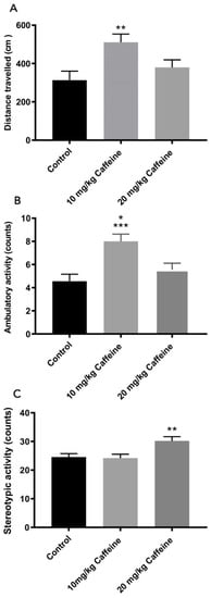 In the locomotor activity test, significant differences amongst the 10 mg/kg caffeine treatment group, the 20 mg/kg caffeine treatment group and the control group were found. The locomotor activity distance of the 10 mg/kg caffeine-treated group was significantly higher in comparison to the control group (p < 0.01) (Figure 3A). Mean number of ambulatory activities in the 10 mg/kg caffeine treatment group was significantly higher than the other two groups (10 mg/kg vs. control p = 0.001; 10 mg/kg vs. 20 mg/kg caffeine p < 0.05) (Figure 3B). Rats treated with 20 mg/kg caffeine showed significantly higher stereotypic movements than those of the 10 mg/kg caffeine treatment and the control group (p = 0.01) (Figure 3C). No change was observed amongst the groups in vertical movements.