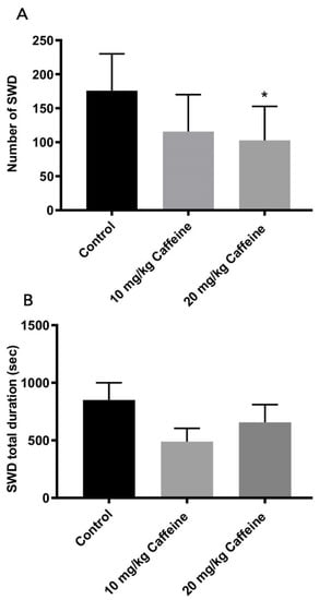 Number (A) and total duration (B) of SWDs in control (n = 7) and 10 mg/kg (n = 7) and 20 mg/kg (n = 7) caffeine-treated WAG/Rij rats. * p < 0.05 in comparison with control group; (one-way ANOVA with post hoc Tukey’s test). Data are means ± S.E.M.