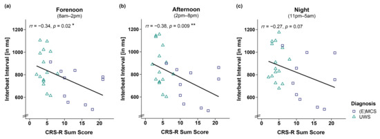 Figure 2. Correlation between interbeat interval (IBI) and CRS-R sum score separately for time. Larger IBIs were associated with lower CRS-R sum scores throughout the (a,b) day (i.e., forenoon, afternoon) and (c) night. Please note that the effect during the night is no longer ‘credible’ from a Bayesian point of view, and will not be interpreted. ** p < 0.01; * p < 0.05. Abbreviations: (E)MCS = (emergence from) minimally conscious state; UWS = unresponsive wakefulness syndrome; ms = milliseconds.