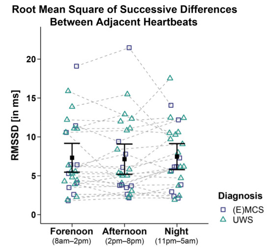 Analyses of the RMSSD of 26 patients did not reveal significant main effects for time (FWTS(2) = 0.4, p = 0.828), diagnosis (FWTS(1) = 0.37, p = 0.554), and time   ×   diagnosis interaction (FWTS(2) = 3.91, p = 0.174; cf. Figure 3). No differences for etiology (i.e., TBI vs. NTBI) or sex (i.e., male vs. female) were observed (cf. Supplementary Materials: Tables S4 and S5).