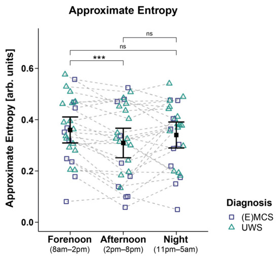 Figure 5. Approximate entropy (ApEn). Patients showed a higher ApEn during forenoon as compared to afternoon. No significant differences were evident between night and day (i.e., night vs. forenoon or afternoon). Error bars represent the mean and 95% confidence interval. *** p < 0.001; ns = not significant. Abbreviations: (E)MCS = (emergence from) minimally conscious state; UWS = unresponsive wakefulness syndrome; arb. units = arbitrary units.