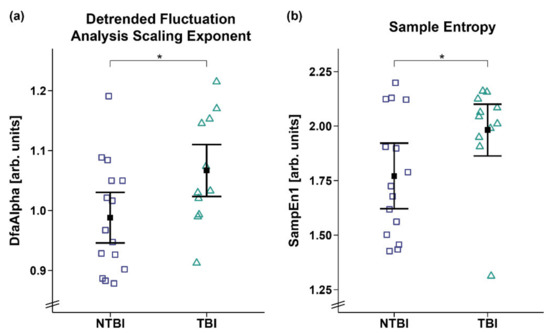 Figure 6. Detrended fluctuation analysis scaling exponent (DfaAlpha) and sample entropy 1 (SampEn1). Patients with TBI showed a higher (a) DfaAlpha and (b) SampEn1 as compared to patients with NTBI. Error bars represent the mean and 95% confidence interval. * p < 0.05. Abbreviations: NTBI = non-traumatic brain injury; TBI = traumatic brain injury; arb. units = arbitrary units.