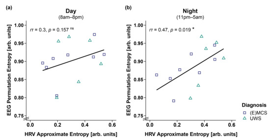 Figure 7. Correlation between EEG permutation entropy (PE) and HRV approximate entropy (ApEn) separately for day and night. (a) While EEG PE and HRV ApEn did not correlate during the day (i.e., 8 a.m.–8 p.m.), (b) a higher EEG PE was associated with a higher HRV ApEn during the night (i.e., 11 p.m.–5 a.m.). * p < 0.05; ns = not significant. Abbreviations: (E)MCS = (emergence from) minimally conscious state; UWS = unresponsive wakefulness syndrome; arb. units = arbitrary units.