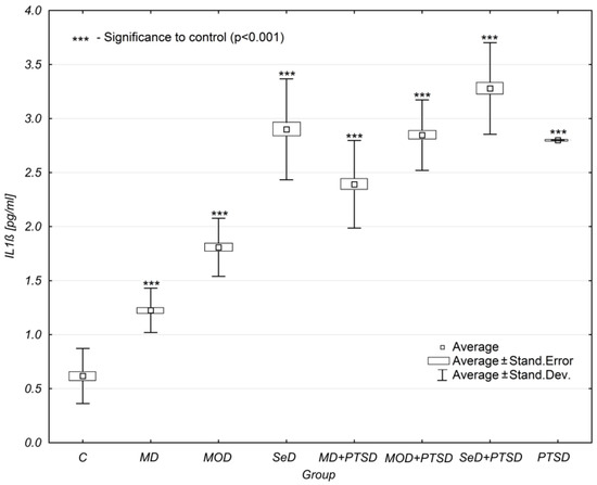 Mean IL-1β concentration levels in selected study groups. Legends: C—control group, MD—mild depression; MOD—moderate depression; SD—severe depression; MD + PTSD—mild depression + posttraumatic stress disorder; MOD + PTSD—moderate depression+posttraumatic stress disorder; SeD + PTSD—severe depression + posttraumatic stress disorder; PTSD—posttraumatic stress disorder; IL-1β—interleukin-1β. Number of patients in study groups (females + males): C = 80, MD = 120, MOD = 120, SD = 120, MD + PTSD = 120; MOD + PTSD = 120; SeD + PTSD = 60; PTSD = 120. *** p < 0.005 when compared to the control group. Since all data was distributed normally, the one-way ANOVA test was used for statistical analysis (data is presented in the form of a box plot, which can be used to estimate differences in the mean values; the graphs show the mean standard error).
