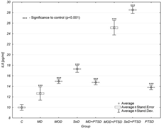 Mean IL-8 concentration levels in selected study groups. Legends: C—control group, MD—mild depression; MOD—moderate depression; SD—severe depression; MD + PTSD—mild depression + posttraumatic stress disorder; MOD + PTSD– moderate depression + posttraumatic stress disorder; SeD + PTSD—severe depression + posttraumatic stress disorder; PTSD—posttraumatic stress disorder; IL-8—interleukin-8. Number of patients in the study groups (females + males): C = 80, MD = 120, MOD = 120, SD = 120, MD + PTSD = 120; MOD + PTSD = 120; SeD + PTSD = 60; PTSD = 120. *** p < 0.005 when compared to the control group. Since all data was distributed normally, the one-way ANOVA test was used for statistical analysis (data is presented in the form of a box plot, which can be used to estimate differences in the mean values; the graphs show the mean and standard error).