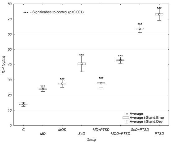 Mean IL-4 concentration levels in selected study groups. Legends: C—control group, MD—mild depression; MOD—moderate depression; SD—severe depression; MD + PTSD—mild depression n+ posttraumatic stress disorder; MOD + PTSD—moderate depression + posttraumatic stress disorder; SeD + PTSD—severe depression+ posttraumatic stress disorder; PTSD—posttraumatic stress disorder; IL-4—interleukin-4. Number of patients in the study groups (females + males): C = 80, MD = 120, MOD = 120, SD = 120, MD + PTSD = 120; MOD + PTSD = 120; SeD + PTSD = 60; PTSD = 120. *** p < 0.005 when compared to the control group. Since all data was distributed normally, the one-way ANOVA test was used (data is presented in the form of a box plot, which can be used to estimate differences in the mean values; the graphs show the mean and standard error).