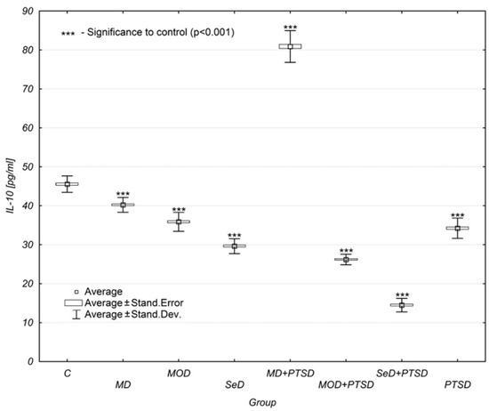 Mean IL-10 concentration levels in selected study groups. Legends: C—control group, MD—mild depression; MOD—moderate depression; SD—severe depression; MD + PTSD—mild depression + posttraumatic stress disorder; MOD + PTSD—moderate depression + posttraumatic stress disorder; SeD + PTSD—severe depression + posttraumatic stress disorder; PTSD—posttraumatic stress disorder; IL-10—interleukin-10. Number of patients in the study groups (females + males): C = 80, MD = 120, MOD = 120, SD = 120, MD + PTSD = 120; MOD + PTSD = 120; SeD + PTSD = 60; PTSD = 120. *** p < 0.005 when compared to the control group. Since all data was distributed normally, the one-way ANOVA test was used for statistical analysis (data is presented in the form of a box plot, which can be used to estimate differences in the mean values; the graphs show the mean and standard error).