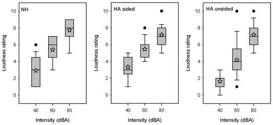 Boxplots of loudness ratings for 1-kHz tone bursts at 40, 60, or 80 dBA for the NH group, the HA group (aided), and the HA group (unaided). The boxes show the 25th and 75th percentiles, the error bars show the 10th and 90th percentiles, the filled circles show outliers, the horizontal lines show the median, and the white stars show the mean.