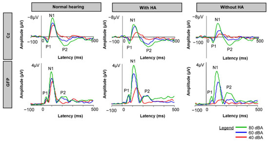 CAEP responses were compared between the NH group and the HA group with the HA on or off at each intensity using Kruskal–Wallis ANOVAs on ranked data; complete results are shown in Table 5. At Cz, N1 amplitude was significantly lower for the NH group than for the HA group with the HA off at all intensities. N1-P2 amplitude was significantly higher for the NH group compared to the HA group with the HA off at all intensities and with the HA on at 40 dBA. P1 latency was significantly shorter for the NH group compared to the HA group with the HA on at all intensities and with the HA off at 60 dBA. N1 latency was significantly shorter for the NH group compared to the HA group with the HA on at 40 and 60 dBA and with the HA off at 60 dBA. For GFP, N1 amplitude was significantly larger for the NH group than for the HA group with the HA off at 40 dB; there were no other significant differences between the NH group and the HA group with the HA on or off. P1 latency was significantly shorter for the NH group compared the HA group with the HA on at all intensities and with the HA off at 80 dBA. N1 latency was significantly shorter for the NH group compared the HA group with the HA on or off at 40 and 60 dBA.