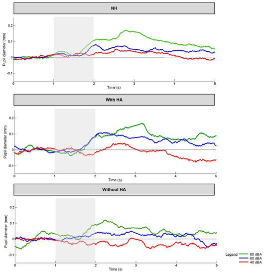Figure 4 shows an example of pupil dilation over time at the three intensities for one NH participant. There was little change in pupil diameter at 40 dB. At 60 dB, there was greater variation in pupil dilation. The largest pupil dilation was observed at 80 dB.