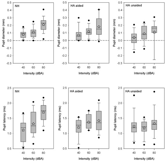 Boxplots of peak pupil diameter (top) and latency (bottom) in response to 1-kHz tone bursts at 40, 60, or 80 dBA for the NH for the NH group and the HA group with the HA on or off. The boxes show the 25th and 75th percentiles, the error bars show the 10th and 90th percentiles, the filled circles show outliers, the horizontal lines show the median, and the white stars show the mean.