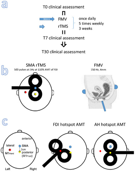 (a) Experimental study design. (b) SMA rTMS site and cup-like and pen-like probe sites for FMV. (c) Single-pulse TMS stimulation sites. Legend: AH: abductor halluces; AMT: active motor threshold; FDI: first dorsal interosseous; FMV: focal muscle vibration; M1: primary motor cortex; rTMS: repetitive transcranial magnetic stimulation; SMA: supplementary motor area; T0: baseline; T30: follow-up visit 30 days after the end of the stimulation protocol; T7: follow-up visit seven days after the end of the stimulation protocol.