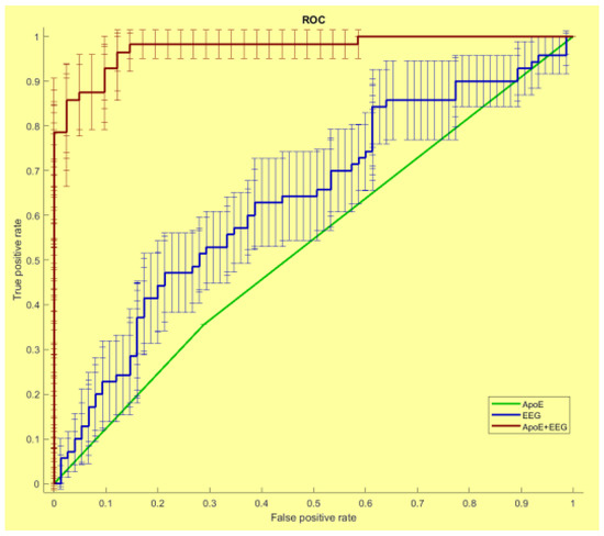 Regarding the SW, the results seem less solid; however, some conclusions can be drawn. Several studies have reported a disruptive reorganization in the brain networks of AD patients in some of the frequency bands analyzed; in particular, the SW values seem to decrease in the delta, theta and in beta bands [33,38,42] and increase in the alpha one [43]. Further studies reported a significant reduction in the SW brain architecture in all the EEG frequency bands computed in mild AD patients compared to healthy controls [25,44]. Other researchers have adopted the SW index as a biomarker of the pathologic conversion of the MCI subject to AD patients, showing a high level of accuracy in combination with other biomarkers, such as Apo-E allele testing [45], as shown in Figure 1.