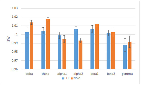 Moreover, in a more recent study on resting state EEG [21], it was found that SW index decreased in the theta and increased in the alpha band, describing a more ordered structure for the lower frequencies and a more random organization for the higher alpha frequencies for PD compared to healthy subjects, as described in Figure 5.