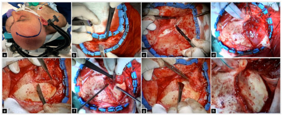 - Oikawa, S.; Mizuno, M.; Muraoka, S.; Kobayashi, S. Retrograde dissection of the temporalis muscle preventing muscle atrophy for pterional craniotomy. J. Neurosurg. 1996, 84, 297–299. [Google Scholar] [CrossRef] [Green Version]