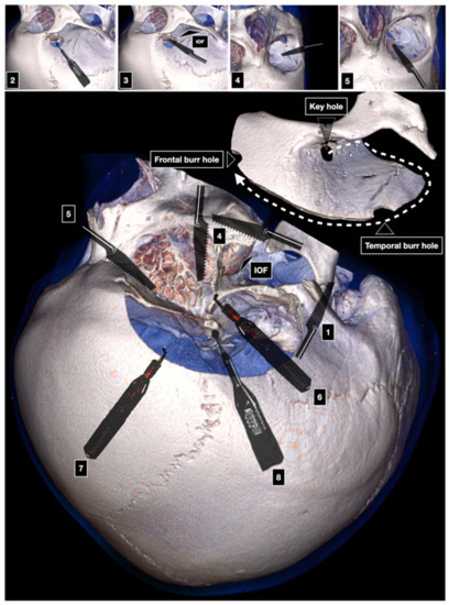 - Matsuo, S.; Komune, N.; Hayashi, D.; Amano, T.; Nakamizo, A. Three-piece orbitozygomatic craniotomy: Anatomical and clinical findings. World Neurosurg. 2019, 128, 106–113. [Google Scholar] [CrossRef] [PubMed]