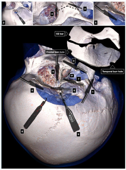 - Zabramski, J.M.; Kiriş, T.; Sankhla, S.K.; Cabiol, J.; Spetzler, R.F. Orbitozygomatic craniotomy. J. Neurosurg. 1998, 89, 336–341. [Google Scholar] [CrossRef] [Green Version]