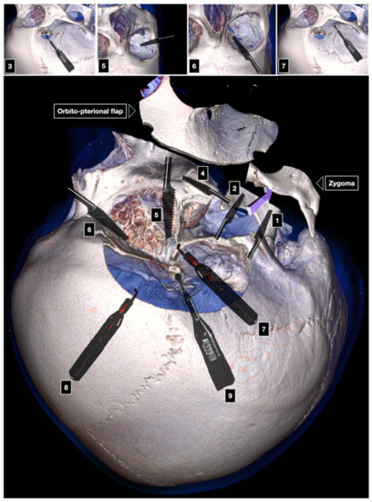 - Seçkin, H.; Avci, E.; Uluç, K.; Niemann, D.; Başkaya, M.K. The work horse of skull base surgery: Orbitozygomatic approach. Technique, modifications, and applications. Neurosurg. Focus 2008, 25, E4. [Google Scholar] [CrossRef] [PubMed] [Green Version]