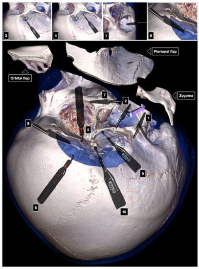 - Schwartz, M.S.; Anderson, G.J.; Horgan, M.A.; Kellogg, J.X.; McMenomey, S.O.; Delashaw, J.B. Quantification of increased exposure resulting from orbital rim and orbitozygomatic osteotomy via the frontotemporal transsylvian approach. J. Neurosurg. 1999, 91, 1020–1026. [Google Scholar] [CrossRef] [Green Version]