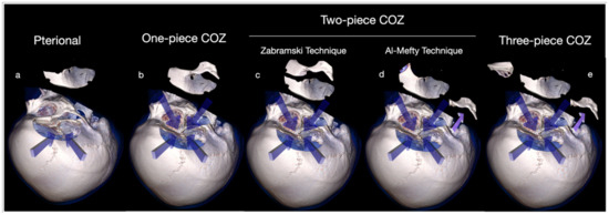 Comparison between pterional approach (a) and one-piece (b), two-piece (c,d), and three-piece (e) COZ approach.