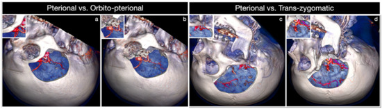 - Da Silva, S.A.; Yamaki, V.N.; Solla, D.J.F.; de Andrade, A.F.; Teixeira, M.J.; Spetzler, R.F.; Preul, M.C.; Figueiredo, E.G. Pterional, Pretemporal, and Orbitozygomatic Approaches: Anatomic and Comparative Study. World Neurosurg. 2019, 121, e398–e403. [Google Scholar] [CrossRef] [PubMed]