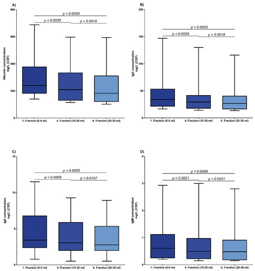 Figure 1 displays the results of the serially taken CSF fractions (CSF fractions 1, 4 and 6). The median CSF concentrations of albumin, IgG, IgA and IgM were significantly lower in the fourth (albumin, 210 mg/L; IgG, 29.35 mg/L; IgA, 3.065 mg/L; and IgM, 0.4935 mg/L) and the sixth (albumin, 182.5 mg/L; IgG, 26.8 mg/L; IgA, 2.78 mg/L; and IgM, 0.4810 mg/L) CSF fraction as compared to the first (albumin, 240.5 mg/L; IgG, 33.95 mg/L; IgA, 3.44 mg/L; and IgM, 0.609 mg/L) CSF fraction. The most significant difference was found between the first and fourth CSF fraction for albumin, IgG, IgA and IgM (p-values are displayed in Figure 1). In addition, the quotients of albumin, IgG, IgA and IgM were significantly lower in the fourth (Q Albumin, 5.51; Q IgG, 2.837; Q IgA, 1.343; Q IgM, 0.4497) and sixth (Q Albumin, 4.862; Q IgG, 2.595; Q IgA, 1.151; Q IgM, 0.4384) CSF fractions than in the first (Q Albumin, 6.154; Q IgG, 3.292; Q IgA, 1.424; and Q IgM, 0.5592) CSF fraction. The p-values for the comparison of CSF-serum concentration quotients are displayed in Supplementary Materials Figure S1. However, a statistically significant linear regression was not found (p-values between 0.0763 and 0.1218). The median IgG index also did not differ significantly among the different fractions (first CSF fraction, 0.5041; fourth CSF fraction, 0.5142; sixth CSF fraction, 0.5116; p-values: 0.7761 and 0.1150), as depicted in Supplementary Materials Figure S2. The median IgA and IgM index did not differ significantly in the fourth (IgA index, 0.2448; and IgM index, 0.0984) and sixth (IgA index, 0.2509; and IgM index, 0.1145) CSF fraction compared with the first (IgA index, 0.2537, and IgM index, 0.1253) CSF fraction (p-values between 0.3531 and 0.6545; Supplementary Materials Figure S2).