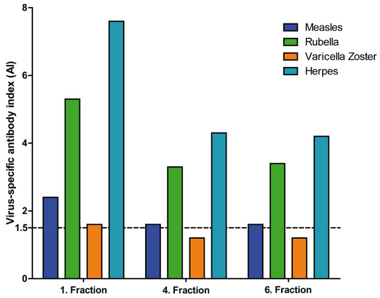 Virus-specific AIs were below the cutoff in all but one patient in the first (medians between 0.9 and 1.0) CSF fraction, and values did not significantly differ in the fourth (medians between 0.9 and 1.0) and sixth (medians between 0.9 and 1.0) CSF fractions (p = 0.3182). The one patient with elevated virus-specific AI (measles, rubella, VZV and HSV) was diagnosed with secondary progressive multiple sclerosis and NPH. Virus-specific AI were lower in the fourth and sixth CSF fraction in this patient. Details are depicted in Figure 2. The AI against VZV even decreased under the cutoff of 1.5, indicating a normal AI in the fourth and sixth CSF fraction.