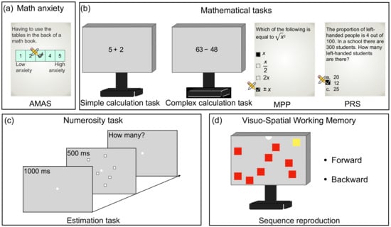 Illustration of task and stimuli. (a) Example of one item of the Abbreviated Math Anxiety Scale. (b) Mathematical tasks. We measured participants’ math performance through two computerized tests (simple and complex calculation tasks) and two paper-and-pencil questionnaires (Mathematics Prerequisites for Psychometrics—MPP, and Probabilistic Reasoning Scale—PRS). (c) Illustration of the numerosity estimation task. (d) VSWM was assessed by a computerized task. Participants observed the sequence of squares turning to yellow and then repeated the sequence in the same (forward condition) or reverse (backward condition) order.