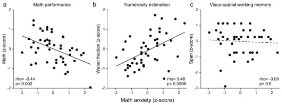 Correlations between math anxiety, formal math performance (a), numerosity estimation acuity (Weber fraction, (b)), and VSWM scores (span, (c)). Lines represent best linear fitting; dots represent individual participant scores. p < Bonferroni corrected α = 0.05/10 = 0.005.