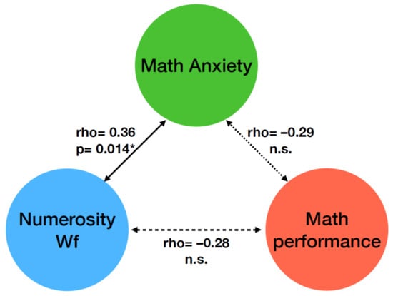 Figure 3 shows that, when controlling for MA, the correlation between formal math performance and numerosity Wf was not statistically significant (rho = –0.28, p = 0.06), suggesting that MA played a crucial role in driving this correlation. The correlation between math anxiety and formal math performance scores was not statistically significant when numerosity Wf was controlled as a covariate (rho = –0.29, p = 0.05), suggesting, on the other hand, that numerosity Wf also had a role in the relationship between MA and math performance. When controlling for formal math performance scores, the correlation between numerosity Wf and math anxiety remained statistically significant (rho = 0.36, p = 0.014), indicating that formal math performance was not sufficient to fully account for the correlation between numerosity perception and MA levels.