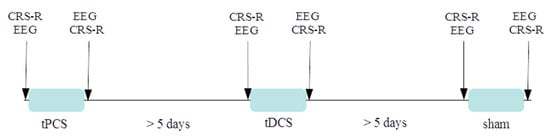 Study protocol: Each patient was evaluated by a trained professional at least twice with the CRS-R before being enrolled in the study to ensure that the patient met the diagnostic inclusion criteria. The protocol included three sessions and each patient completed all three sessions in a random order: (i) tPCS, (ii) tDCS, and (iii) sham. Each session was separated by a minimum of five days to avoid any carryover effect. This washout period was established based on similar studies and on the fact that the effects of a single session of tDCS should not last more than a few hours after the end of stimulation [37]. Each session was structured as follows: the CRS-R was performed, and 10 min of resting EEG were recorded. Twenty minutes of stimulation were launched. After the stimulation, the CRS-R and the EEG were collected again. For a schematic view of the protocol, see Figure 1.