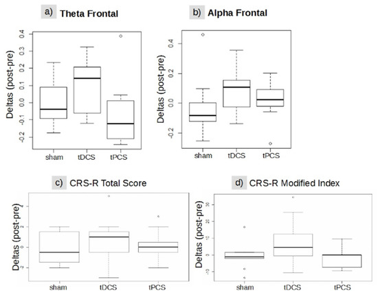 (a–d) Boxplot group differences between treatment conditions. (a) Functional connectivity in the frontal theta band, (b) in the frontal alpha band, (c) CRS-R total score, and (d) CRS-R modified index. The rectangles represent the interquartile range 25 and 75; the bold horizontal lines inside the rectangles are the medians of each group, empty circles indicate potential outliers (minimum or maximum value in the data) whereas the whiskers are calculated by the default boxplot R function and represent 1.5 distance from IQR 25 and IQR 75. CRS-R = Coma Recovery Scale-Revised, Sham = sham treatment, tDCS = transcranial direct current stimulation treatment, tPCS = transcranial pulsed current stimulation treatment, IQR = interquartile range.