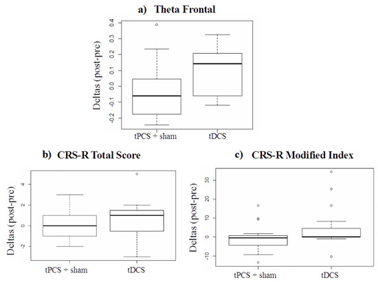 Group differences between treatment conditions on ([tPCS + sham]) and tDCS: (a) on theta frontal functional connectivity, (b) on CRS-R total score, and (c) on CRS-R modified index. Calculated with unpaired Wilcoxon signed-rank test. tPCS = transcranial pulsed current stimulation, sham = sham, tDCS = transcranial direct current stimulation.