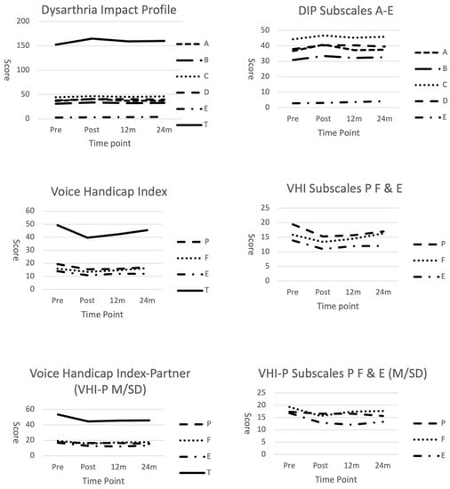 Results of the Friedman’s tests revealed a significant effect for time for the DIP (x2 = 319.12; p = 0.0001), VHI (x2 = 141.77; p = 0.0001), and VHI-P (x2 = 136.92; p = 0.0001). No significant effect for time was identified for the PDQ-39 (x2 = 0.625; p = 0.987). Planned comparisons of the DIP, VHI, and VHI-P data using the Wilcoxon signed-rank test and an alpha level of p < 0.01 failed to identify any significant differences across the time points for these outcome measures (see Table 3). However, a series of line graphs provide a descriptive view of the trends in the data across the subscales and total scores for these outcome measures. For the DIP, the total score and subscale data reflect a slight lessening of the impact of the speech disorder on the cohort post-treatment, which is maintained above the pre-treatment level across time (See Figure 1). For the VHI and VHI-P, there is a trend of a decrease in the overall voice handicap immediately post-treatment, with maintenance of this effect below pre-treatment levels across 24 months. The physical, functional, and emotional subscales of these measures reflect a similar pattern (See Figure 1).