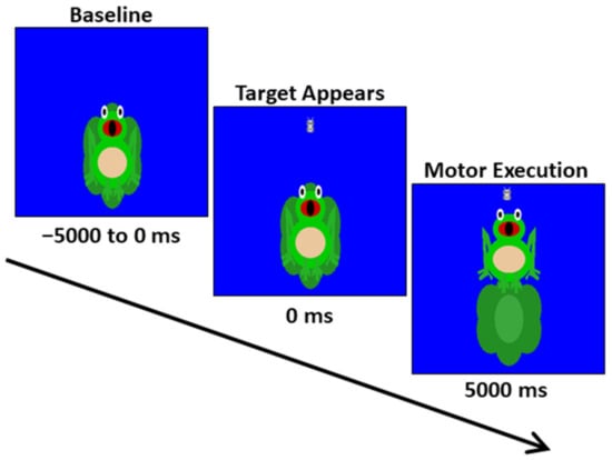 The youth were seated upright in a magnetically silent chair during the experiment. A custom-built magnetically silent force transducer was used to measure the isometric knee extension forces generated by the youth as they completed a Frog Task that we have used in our prior studies [41]. The Frog Task experimental paradigm involved the participant generating an isometric knee extension force with their right leg, between 15 and 30% of their maximum isometric force, to move a frog vertically and match a target, which appeared as a moth (Figure 1). The participants were instructed to match the presented targets as quickly and as accurately as possible. A successful match occurred when the moth that represented the target force was inside of the frog’s mouth for 300 ms, and the amount of force required by the participant was presented randomly. The stimuli were shown on a back-projection screen that was approximately 1 m in front of the participant at eye-level. Each trial was 10,000 ms in length. The participants started each trial at rest, fixating on the center of the screen for 5000 ms. After this rest period, the target moth appeared, prompting the participant to generate the isometric knee extension and match the target. The target was available to be matched for up to 5000 ms. Once either the target was matched or 5000 ms elapsed, feedback was given to indicate the end of the trial, and the participant returned to rest and fixated on the center of the screen while waiting for the next target to appear. The participants completed 120 target matching trials.