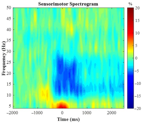 Group-averaged time frequency spectrogram from a sensor located over the leg region of the contralateral (left) motor cortex. Frequency (Hz) is denoted on the y-axis and time (ms) is denoted on the x-axis, with 0 ms representing movement onset of the knee extension. Signal power is expressed as percentage change from baseline with the color bar shown on the right. As discerned, there was a desynchronization within the beta frequency (18–24Hz) that was strongest from −250 to 250 ms.