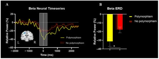 (A) Group averaged beamformed image of the beta ERD (18–24Hz, −250 to 250 ms) is shown in the bottom left. The neural time course reflects the response power with percent change from baseline denoted on the y-axis and time denoted on the x-axis. The time interval image is depicted by the light gray box and the white line at time zero reflects movement onset. (B) Bar graph representing differences in the strength of the beta ERD between the individuals with CP with and without the polymorphism. The individuals with CP who had a polymorphism at the BDNF gene had a stronger beta ERD in comparison to the individuals with CP without a polymorphism (p = 0.042). * indicates p < 0.05.