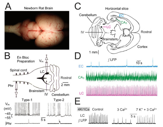 Spontaneous rhythms in LC, cortex and hippocampus of horizontal newborn rat brain slices. (A) The image in the upper left section shows a dorsal view on the isolated brain and parts of the cervical spinal cord. (B) Displays in upper part a schema for simultaneous suction electrode recording of integrated inspiratory-related phrenic nerve (Phr) activity from a ventral spinal rootlet and whole-cell membrane potential (Vm) recording from neurons in the LC indicated as a black oval located close to the 4th ventricle (IV). The lower part illustrates that spontaneous inspiratory phrenic bursts evoke in both neurons an initial acceleration of spontaneous LC neuron action potential (‘spike’) discharge followed by a hyperpolarization and concomitant spike blockade lasting ~5 s. In the ‘type-1′ neuron on the left, subthreshold oscillations (STOs) of Vm and concomitant spike discharge are very regular, contrary to more irregular STOs and spiking in the ‘type-2’ neuron in the right (C) Schema of a 400 µm thick horizontal slice at a section level that enables simultaneous recording of spontaneous local field potential (LFP) rhythms in entorhinal cortex (EC), CA3 hippocampal area (CA3), and LC brainstem area. (D) Simultaneous suction electrode recordings from the surface of a slice kept in superfusate containing (among other components) 4 mM K+ and 1 mM Ca2+ (‘4K/1Ca’). LFPs were differentially amplified (×10 k) and band-pass filtered (0.3–3 kHz) and integrated at a time constant of 20 ms using a ‘moving averager’. Note that rhythms have a rate of 1–4 bursts/min in EC, 10–40 bursts/min in CA3 area and 0.5–3 Hz in LC. (E) An increase of superfusate Ca2+ from physiological 1 to 3 mM, almost abolishes the LC LFP. Use of elevated superfusate Ca2+ might partly explain why LFPs have not been recorded previously in LC. Note that our group uses typically a 3K/1.2Ca superfusate. (A) from [20]; (B) adapted with permission from [21]; (C–E) adapted with permission from [22].